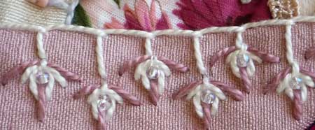 This seam is on block 43 of the I Dropped the Button Box crazy quilt. It is made of a line of buttonhole stitch topped with tulip stitch that has a seed bead in the middle.