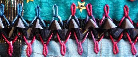 This seam is to be found on block 45 of the I Dropped the Button Box crazy quilt. It is covered with an interesting braid that has been secured tot he block with fly stitch tied with a detached chain