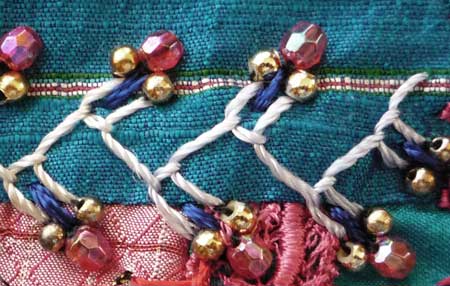 This seam is to be found on block 45 of the I Dropped the Button Box crazy quilt. It is feather stitch decorated with beads.