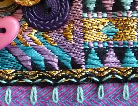 This seam is to be found on block 46 of the I Dropped the Button Box crazy quilt. It is covered with a commercial braid. Along the edge I worked a line of fly stitch, tied with detached chain stitches. I then laced them with a black rayon ribbon floss.