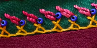 This seam decoration from block 47 of the I Dropped the Button Box crazy quilt is made up of a line of crossed buttonhole, detached chain stitch and a seed bead.