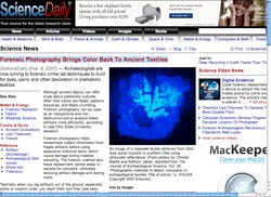 Researchers are now using forensic photography to glean information from artefacts found in from burial mounds built 1600 years ago. Pieces of fabric recovered from Ohio ‘s Seip burial mounds show gradations of color under different light sources and this safer research technique is being applied more widely to fragile fibers.