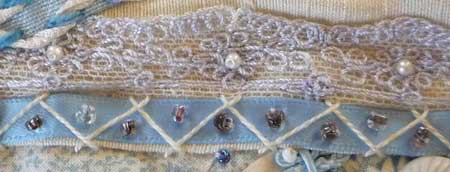 This seam hides the edge of some lace. It is a line of herringbone stitch used to couch down some satin ribbon. I used some seed beads in the hills and valleys of the herringbone stitches. The seam is found on block 52 of the I Dropped the Button Box Quilt.
